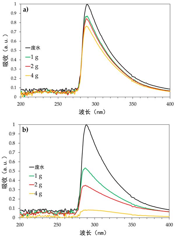 彩运cy888 图3:生物炭样品(a)和活性炭样品(b)的洗涤塔废水的UV-Vis曲线与碳量的关系。