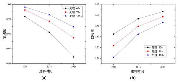 图2:进料时间和吹扫时间对真空变压吸附循环的氢纯度(a)和回收率(b)的影响。