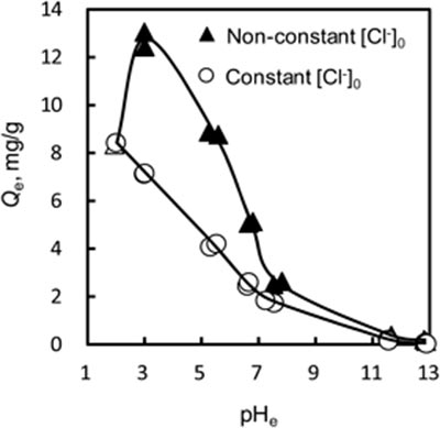 彩运cy888 活性炭上的硝酸根离子吸附量与溶液的pH e之间的关系如图1所示。硝酸根离子在碱性条件下几乎不被吸附,这意味着氢氧根离子会抑制硝酸根离子的吸附。另一方面,随着平衡pH的降低,硝酸根离子的吸附量增加。在碱性条件下,由于硝酸根离子与活性炭表面之间的静电排斥,硝酸根离子很难被吸附在活性炭上。另一方面,硝酸根离子的吸附量在酸性条件下增加,这归因于硝酸根离子与碳表面之间的静电吸引力。然而,随着平衡pH从3.0降低到2.0,观察到硝酸根离子吸附的显着降低。在此pH范围内,氯离子的初始浓度从2 m增加到20 m M,这意味着共存的氯离子会抑制硝酸根离子的吸附。通过NaCl溶液将氯离子的初始浓度固定在20 m M时,可以清楚地发现氯离子对硝酸根离子的吸附抑制作用,表明硝酸根离子在所有pH区域的吸附量均低于没有任何pH调节的溶液。因此共存阴离子会导致竞争吸附影响硝酸根离子吸附的效果,并且这种作用可能是较强的在共存阴离子的浓度较高。