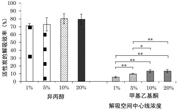 如示于图2所示,异丙醇的解吸效率不会受表面活性剂浓度。然而,在甲基乙基酮中,当表面活性剂浓度增加至10%时,解吸效率增加。表面活性剂的去污力和增溶能力都有助于有机溶剂从活性炭中解吸附。