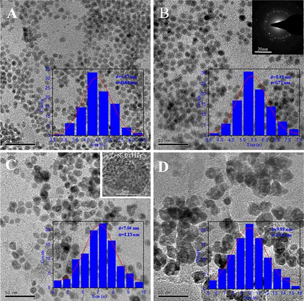活性炭中镍的透射电子显微照片(图1的A-d),纳米粒子为球形且均匀地分布,这表明金属磷化物纳米颗粒的相对尺寸和分散度的化学反应过程中合成。在催化剂合成过程中,油胺起还原剂的作用,从而控制成核速率。同时,三辛基膦用作磷源和稳定剂,通过Ni(0)表面的配位提供可调的表面稳定性。在合成中,对于少量三辛基膦,发生Ni(II)前体的快速还原,导致Ni(0)物质的重要浓度,其不能被溶液中存在的配体有效稳定。然后,快速聚集过程的结果形成大尺寸的磷化镍纳米颗粒在活性炭载镍催化剂。然而,当油胺的量减少时,制备少量核,并且大量三辛基膦的存在抑制它们的生长,导致形成小的纳米颗粒。此外,所选择的区域的电子衍射和晶格条纹的图像(在所示图1 B,C)表明,球形磷化镍纳米粒是单晶。因此,它的尺寸大于Ni 2通过改变油胺和三辛基膦的浓度可以很容易地调节活性炭催化剂,这提供了一种精确控制其尺寸在4到10nm范围内的方法,在这些方法中,这些磷化镍纳米颗粒在活性炭上以各种尺寸负载将具有不同的属性可能导致不同的反应性。