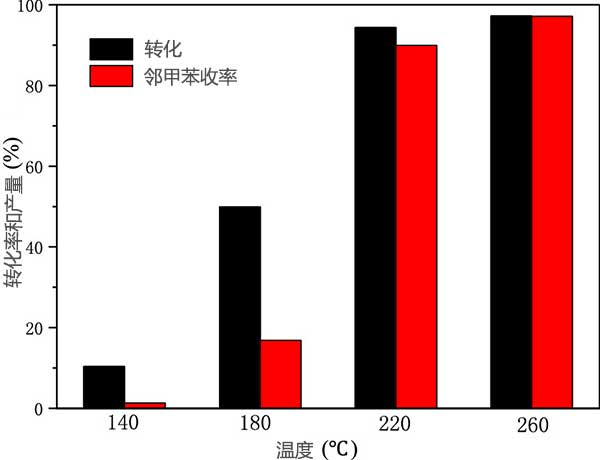 为了评价制备的磷化镍活性炭的有用性,进行对生物油模型化合物加氢脱氧的活性。在测试中,我们使用SA(水杨醛)作为热解油的代表性组分来探索加氢脱氧途径。在这项工作中,SA转化为邻甲酚可以通过路径氢化/氢解或C=O键的直接氢解进行。图2显示了加氢脱氧相对于镍的转化率和产率活性炭受反应温度影响。结果表明,随着反应温度的升高,SA的转化率和邻甲酚的收率逐渐增加。当反应温度为260℃时,邻甲酚目标产物的产率较大,2小时达到97.1%,这表明反应温度显着提高了它的区域选择性加氢脱氧的催化活性。