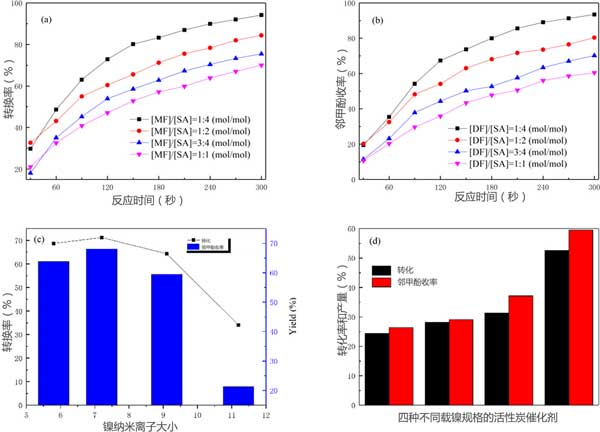 尽管碳水化合物衍生的化合物在加氢脱氧过程中对芳族化合物有影响,但是之前的一些热解油升级的研究集中在加氢脱氧反应中碳水化合物衍生的化合物和木质素衍生的芳族化合物之间的相互作用。在这次研究中,用活性炭催化从酚级分(SA)产生的碳水化合物衍生物的(MF)的加氢脱氧的热解油的效果进行了研究(在图3所示)。MF的存在对SA的转化和邻甲酚的收率产生了很大的影响。在不存在MF的情况下,SA的转化率为99%,持续180分钟,相应的邻甲酚产率为97%。随着反应物中MF比例的增加,SA转化率和邻甲酚产率均显着降低。当(MF)/(SA)值为1.00(mol / mol)时,SA的转化率和邻甲酚的收率分别从99%和97%急剧下降至70%和60%,这表明通过在反应物中存在MF,抑制了SA的反应性。